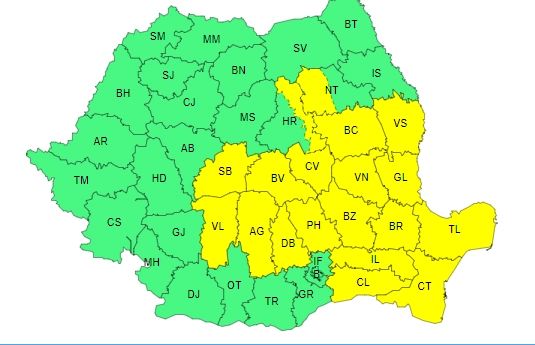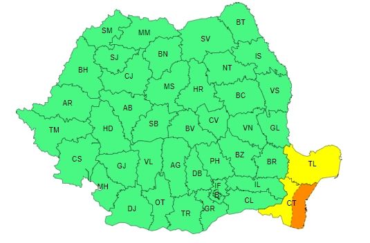 Meteorologii au emis, joi, atenționări de tip cod galben și potocaliu de instabilitate atmosferică, valabile în mai multe zone din țară. Astfel, potrivit ANM, de astăzi, de la 10.00 și până diseară, la ora 23.00, este valabil un cod galben de instabilitatea atmosferică și cantități însemnate de apă în Dobrogea, jumătatea de sud a Moldovei, sudul Transilvaniei, nordul și estul Munteniei, nord-estul Olteniei, local în Carpații Orientali și Meridionali. Tot astăzi, dar de la ora 23.00 și până mâine, la ora 10.00, va intra în vigoare un cod porocaliu ce prevede averse torențiale, importante cantitativ. Confrm ANM, codul este valabil pentru zona litorală a județului Constanța.
