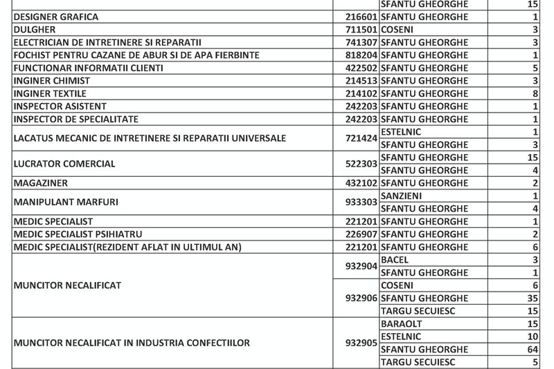 Conform tabelului, putem observa că şi în această perioadă cele mai multe locuri de muncă disponibile se adresează muncitorilor necalificaţi (158), în timp ce 63 de joburi sunt disponibile pentru confecţioneri de textile.Pentru cei cu studii superioare sunt disponibile, ca de obicei, puţine locuri de muncă, însă putem observa oferte pentru 9 medici, dintre care 6 rezidenţi aflaţi în ultimul an.Pentru informații, mediere și repartiții puteţi să apelaţi la birourile nr.4 și 5 de la sediul AJOFM din Sfântu Gheorghe, str. Grigore Bălan, nr. 14.Lista completă poate fi studiată mai jos: