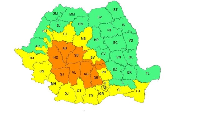 ”În judeţele Hunedoara, Alba, Sibiu, Gorj, Vâlcea, Argeş, Dâmboviţa şi zona de munte a judeţelor Braşov şi Prahova vor fi averse torenţiale. În intervale scurte de timp (1-3 ore) sau prin acumulare cantităţile de apă vor fi de 30...40 l/mp şi izolat de peste 50...60 l/mp”, a mai transmis ANM.