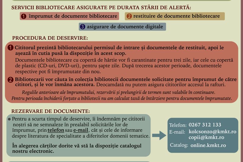Primirea cititorilor se va face cu respectarea măsurilor impuse pe durata stării de alertă, prin grădina de la colțul clădirii (cea cu scara în spirală), la una dintre ferestrele secției de împrumut pentru adulți.„Pe durata stării de alertă biblioteca oferă cititorilor următoarele servicii: împrumut de documente bibliotecare, restituire de documente bibliotecare, asigurare de documente digitale. Pentru a scurta timpul de deservire, îi îndemnăm pe cititori să semnaleze în prealabil solicitările de împrumut, prin telefon sau e-mail”, transmit reprezentanții bibliotecii.Tot de marți se va redeschide și filiala din strada Sporturilor, urmând să funcționeze conform orarului obișnuit. Cititorii vor putea fi primiți doar după măsurarea temperaturii la intrarea în incintă, și cu obligativitatea purtării unei măști de protecție.Pe durata stării de alertă, Biblioteca Județeană va funcționa în zilele de marți, între orele 09:00-19:00, miercuri, joi și vineri între orele 09:00–17:00, și sâmbătă între 09:00–13:00.Cei interesați pot consulta catalogul online accesând site-ul: www.online.kmkt.ro, iar solicitările pot fi făcute la adresele de e-mail: [email protected] și [email protected].
