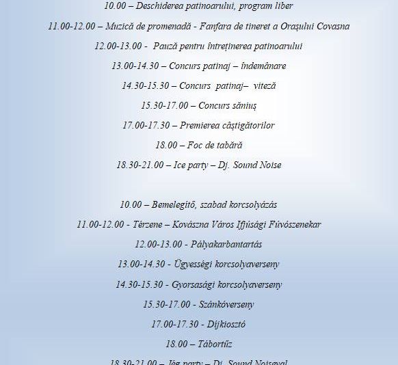 Sâmbătă, 12 ianuarie, patinoarul mobil amplasat la baza pârtiei de schi „Lőrincz Zsigmond” din stațiunea Covasna, va deveni pentru o zi „scena” primului festival dedicat sporturilor pe gheață, organizat de Primăria stațiunii.
