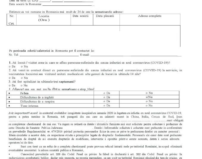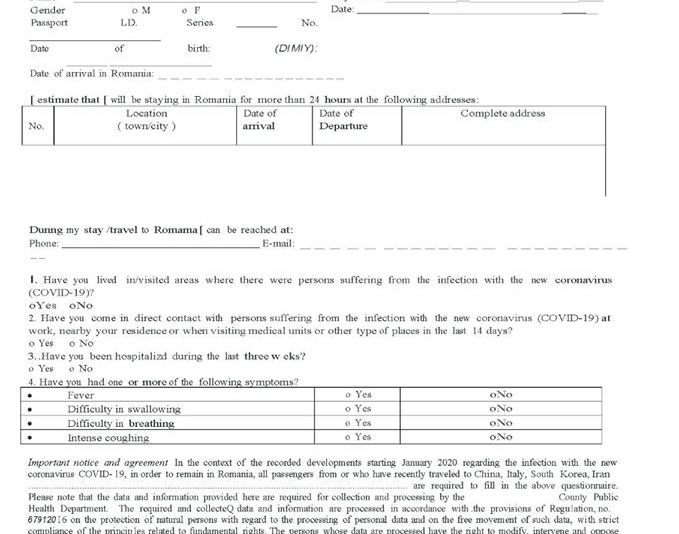 Modelul declarației care trebuie completată OBLIGATORIU la intrarea în România