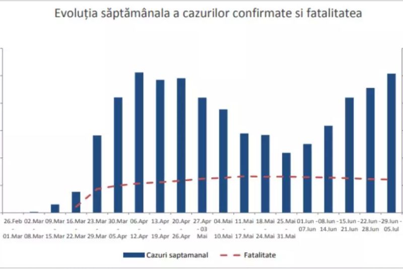 GRAFIC INSP: Evoluția săptămânală a cazurilor confirmate și fatalitatea, de la începutul epidemiei de coronavirus 29 iunie - 5 iulie 2020