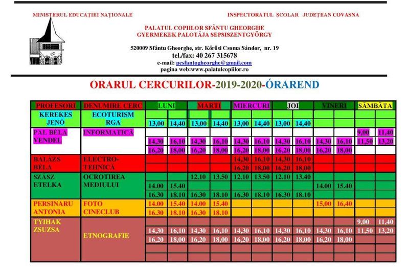 Peste 20 de cercuri figurează în oferta Palatului Copiilor din Sfântu Gheorghe pentru anul școlar 2019-2020, conform conducerii instituției, printre acestea numărându-se dans modern, orientare turistică, aeromodelism, schi, înot, ecoturism, șah, etnografie, karting sau vânătoare de vulpi.