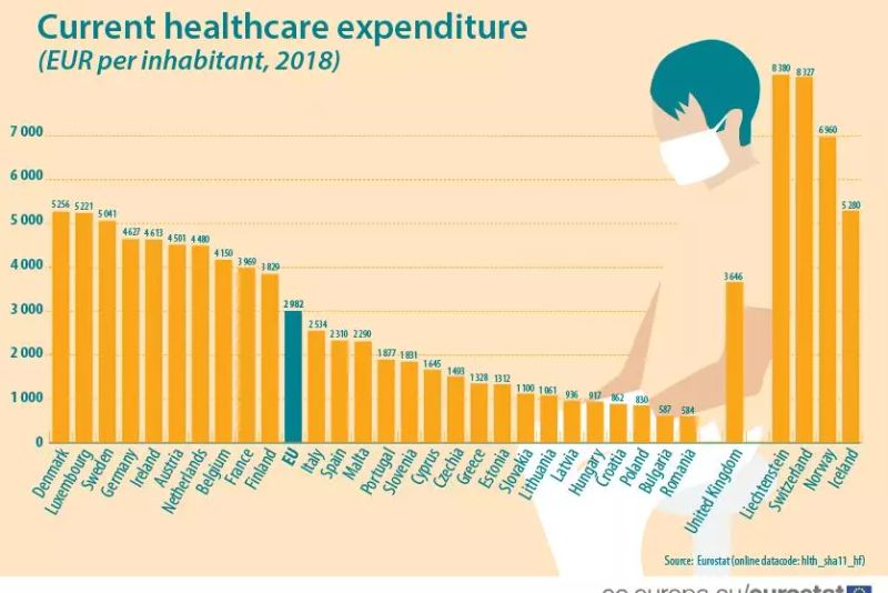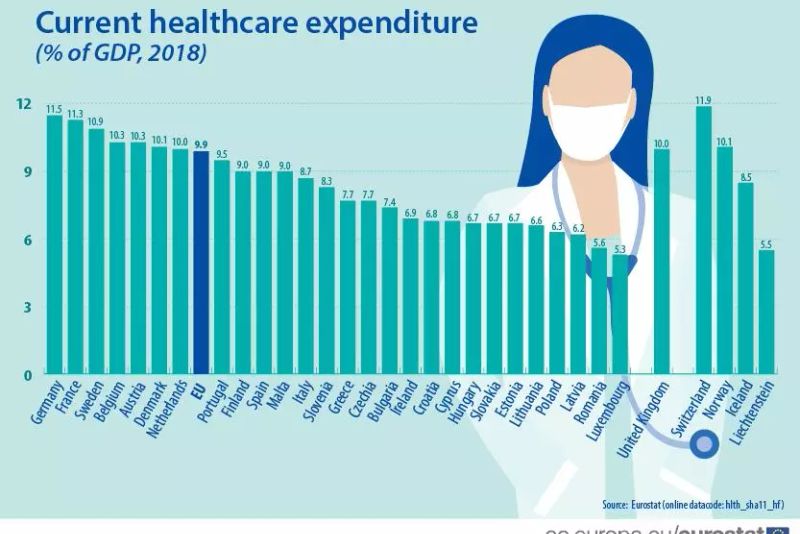 În medie, cheltuielile cu sănătatea în UE au reprezentat 9,9% din PIB în 2018. Cele mai mari ponderi au fost înregistrate în Germania (11,5% din PIB), Franţa (11,3% din PIB) şi Suedia (10,9% din PIB), potrivit raportului Eurostat, citat de realitatea.net