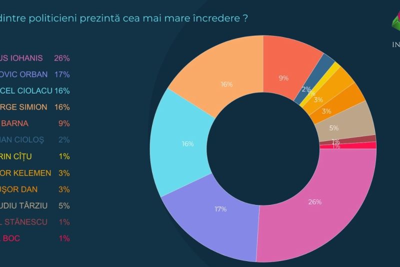 La capitolul încredere în politicieni, Klaus Iohannis ocupă poziția fruntașă, cu 26%, urmat de Ludovic Orban - 17% și Marcel Ciolacu - 16%.