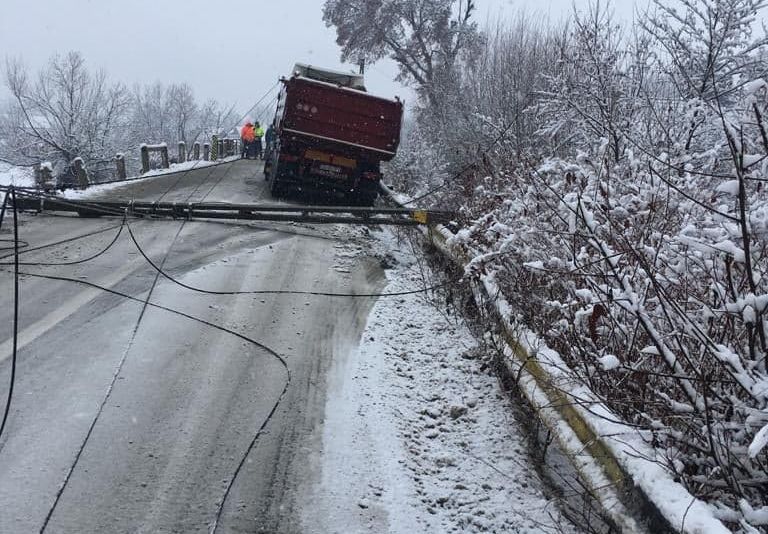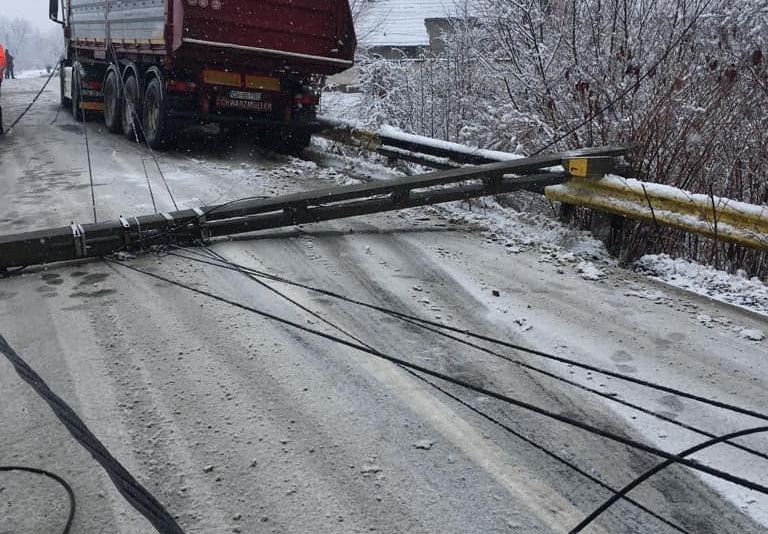 Stâlp de electricitate dărâmat de un autocamion, pe DN13, la Araci