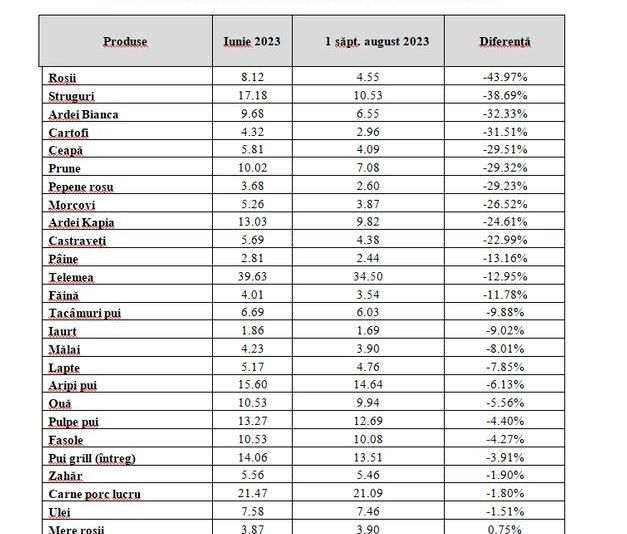 Astfel, faţă de luna iunie, în prima săptămână din august, cele mai mari scăderi de preţuri s-au înregistrat la fructe şi legume: preţul roşiilor a scăzut cu aproape 44%, în timp ce strugurii costă mai puţin cu circa 38%, iar ardeii, cu 32%. Reduceri de preţ au fost înregistrate şi la cartofi, ceapă, prune, pepene şi morcovi.