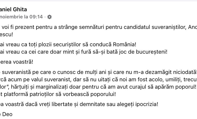 Într-un mesaj postat, sâmbătă, pe contul său de Facebook, Ghiță a declarat că va fi prezent pentru a participa la strângerea de semnături în sprijinul Ancăi Alexandrescu, pe care o descrie drept „o suveranistă autentică”.