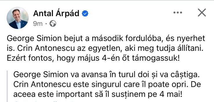 O postare recentă apărută pe rețelele de socializare, semnată de Antal Árpád — primarul municipiului Sfântu Gheorghe și lider marcant al UDMR — a stârnit valuri de reacții în spațiul public. În mesajul său, edilul îndeamnă comunitatea maghiară să îl sprijine pe Crin Antonescu în turul al doilea al unei competiții electorale, pe motiv că acesta ar fi „singurul capabil să-l oprească pe George Simion”.