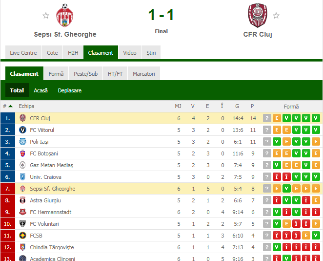 Sepsi OSK - CFR Cluj, scor final 1-1